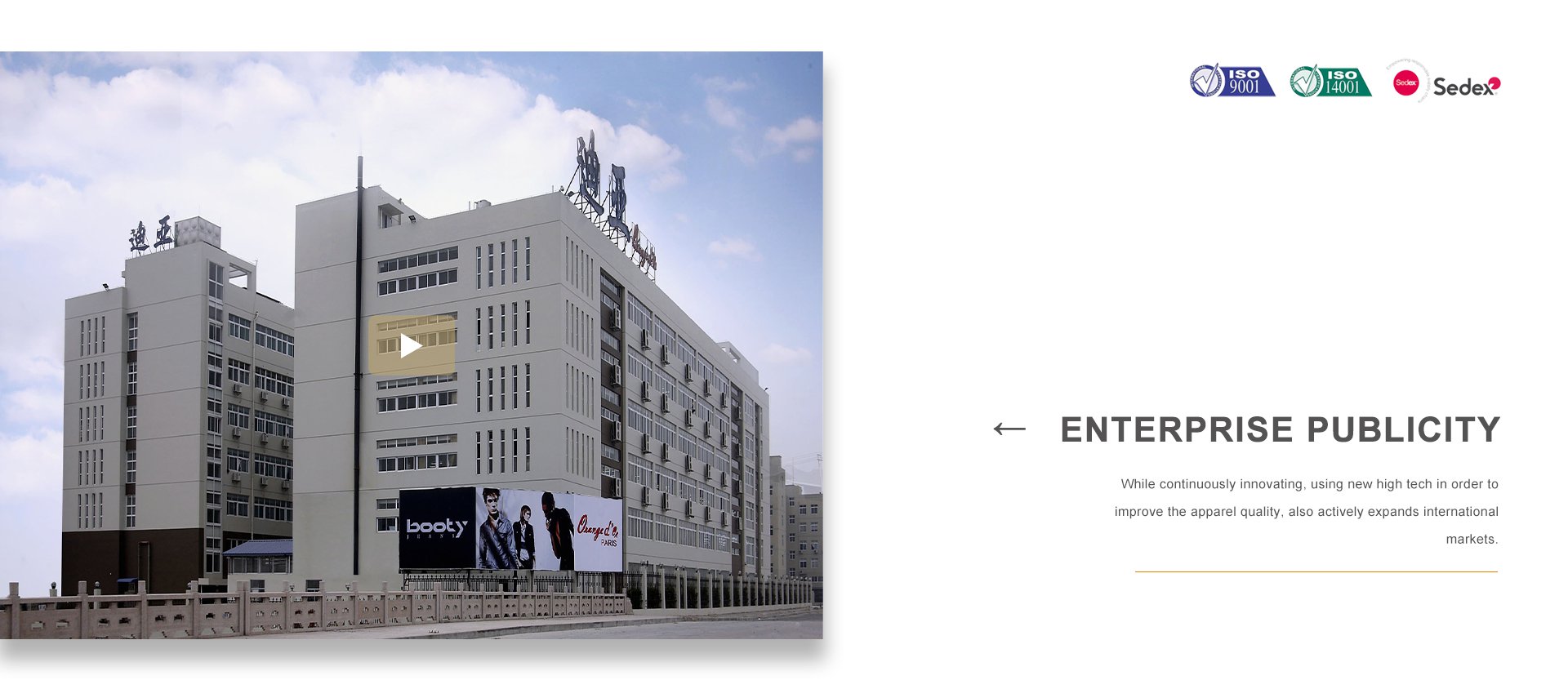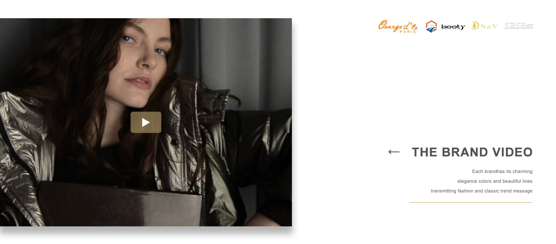 品牌建設是公司堅持不懈的追求,我們每年都會積極參加國內(nèi)外舉辦的各大服裝展銷會。憑借著良好的質(zhì)量與信譽,市場占有率在逐漸擴大,產(chǎn)品遠銷歐洲、美洲、亞洲等國。公司以生產(chǎn)棉衣、羽絨服、派克、大衣、夾克、運動休閑服飾等為主,旗下主打品牌有 ORANGE D’OR 、CLAIRVAL、BOOTY JEANS 、S&V和SASAEC,各品牌服飾均以典雅的色彩、優(yōu)美的線條、卓越的魅力吸引著都市麗人,將時尚、經(jīng)典的潮流信息予以淋漓盡致的演繹。